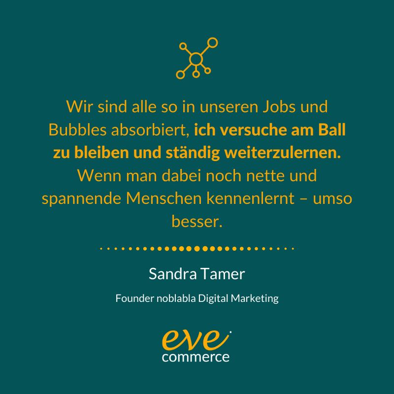Wir sind alle so in unseren Jobs und Bubbles absorbiert, ich versuche am Ball zu bleiben und ständig weiterzulernen. Wenn man dabei noch nette und spannende Menschen kennenlernt – umso besser. Ich war erst bei einem Apero von evecommerce dabei, aber dieser Abend hat mir richtig Spass gemacht. Der Austausch mit anderen Mitgliedern ist für mich als selbstständige Unternehmerin unglaublich wertvoll.